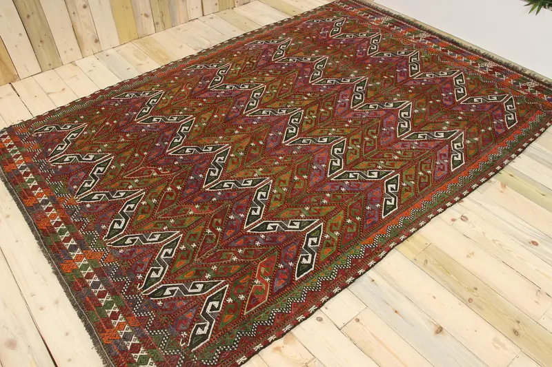 6.3x9.6 ft Halı, Türk Vintage Halı, Kırmızı Yeşil Kamuflaj Yün Halı