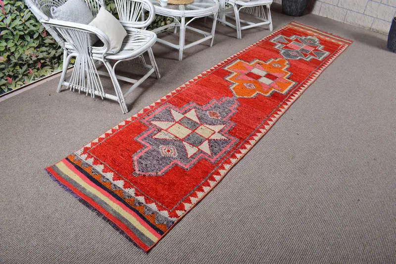 Vintage Halı, 2.5x11.3 ft Runner Halı, Kırmızı Gri Yün Halı