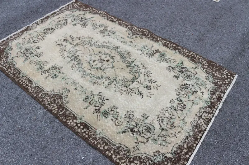 Türk 4x6.4 ft Halı, Vintage Alan Halısı, Kahverengi Bitkiler ve ağaçlar Yün Halı