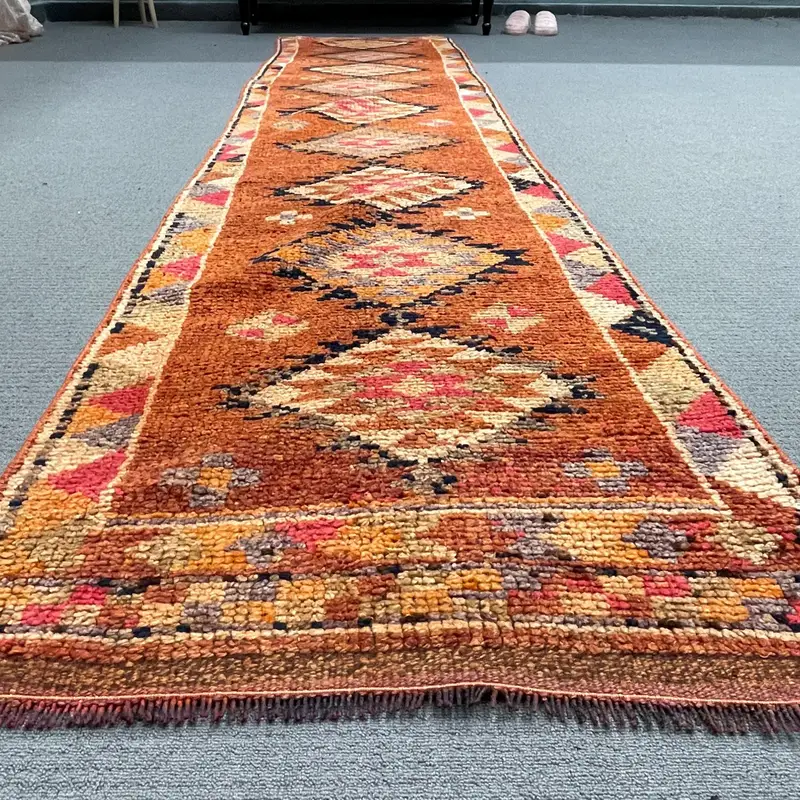 Vintage Halı 2.5x10.6 ft, Kahverengi Kırmızı Kareli Yün Türk Halısı