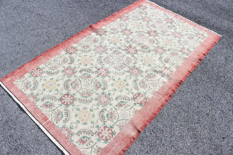 Vintage 3.9x6.6 ft Halı, Türk Halısı, Kırmızı Patchwork Halı Yün