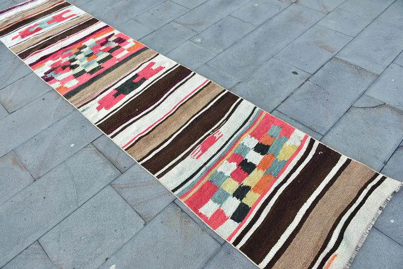 Vintage Türk Halısı 2.3x11 ft (69x335 cm), Kahverengi Kareli Halı