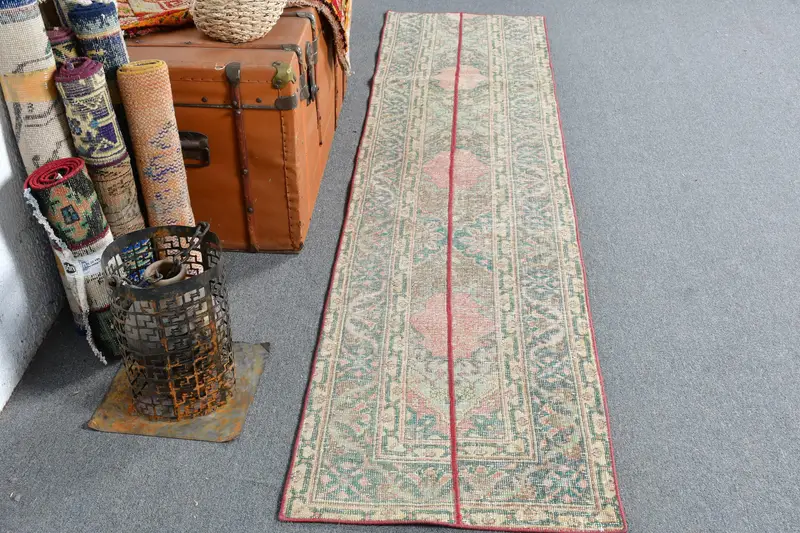 2x8.3 ft Vintage Halı, Yeşil Çizgili Türk Halısı Yün