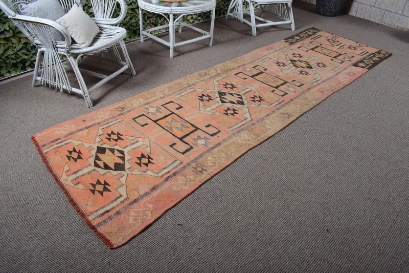 3.3x10.8 ft Türk Halısı, Vintage Runner Halısı, Turuncu İkat Yün Halısı