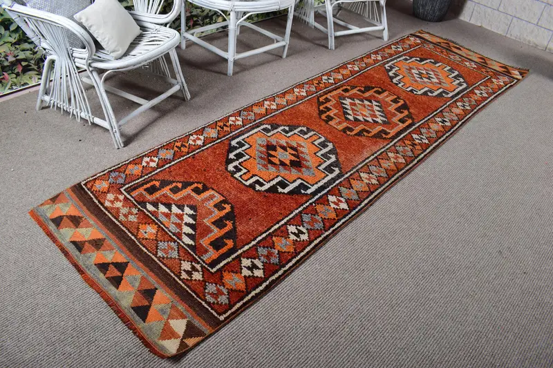 Vintage Türk Halısı, Yolluk 2.9x10.4 ft (88x316 cm) Halı, Kırmızı Soyut Yün Halı