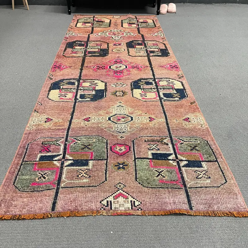 Türk Halısı, 3.3x8.8 ft Vintage Halı, Kırmızı Bordürlü Yün Halı