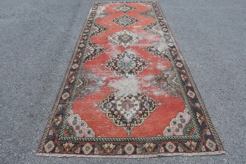 4.7x12.1 ft Vintage Halı, Kilim, Kırmızı Çiçekli Halı Yün
