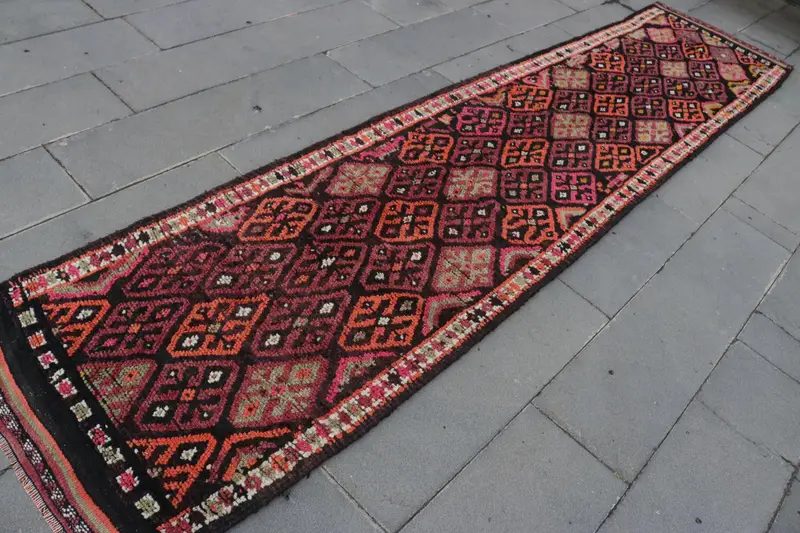 Türk Vintage Runner Halısı 2.7x12.9 ft, Kırmızı Siyah Çiçekli Halı