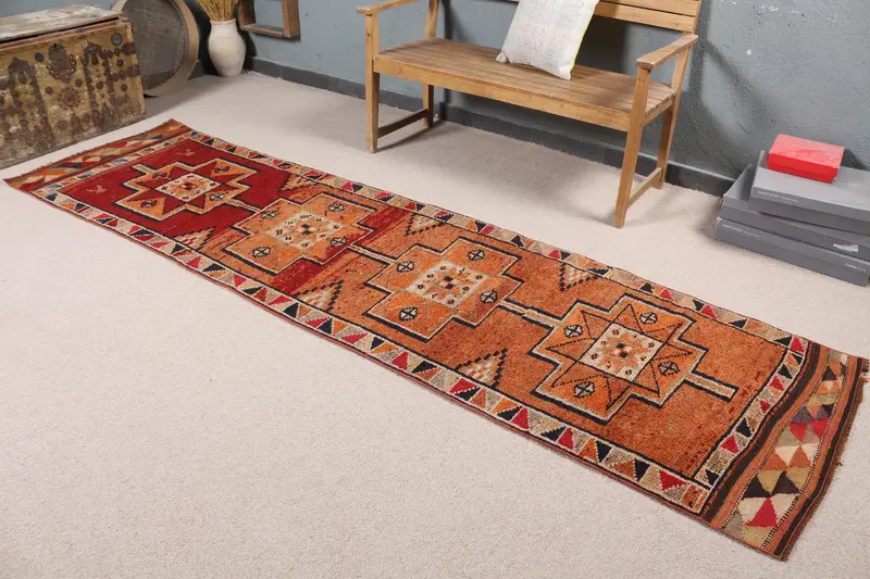 Vintage 2.8x10.5 ft Runner Halı, Türk Halısı, Kırmızı Puantiyeli Halı