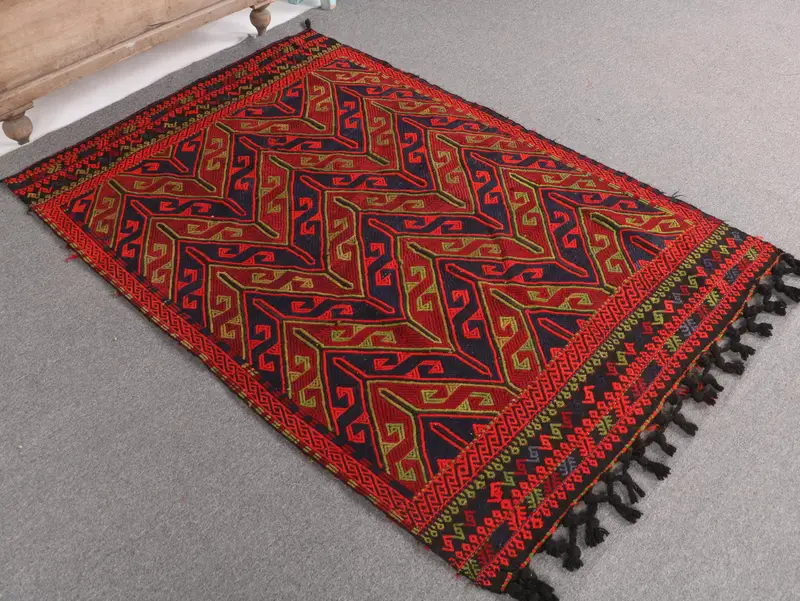 3.8x5.8 ft Halı, Vintage Türk Halısı, Kırmızı Mavi Çiçekli Yün Halı