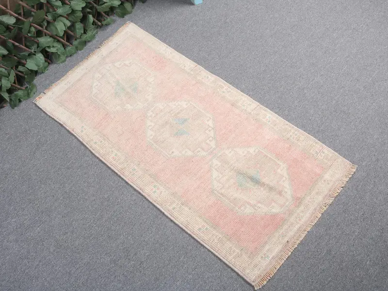 1.8x3.6 ft Vintage Halı, Türk Küçük Halısı, Pembe Kareli Yün Halı