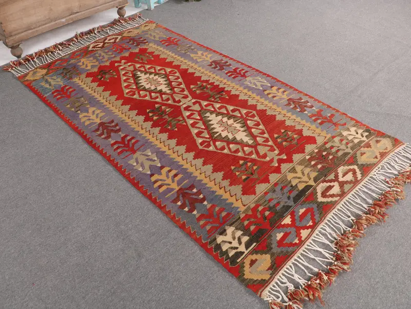 3.9x7.2 ft Türk Alan Halısı, Kırmızı Mavi Vintage Patchwork Yün Halı