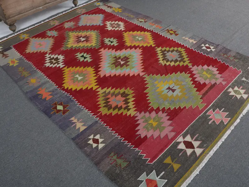 Türk 5.7x8.1 ft Büyük Halı, Vintage Halı, Kilim Kırmızı Puantiyeli Halı