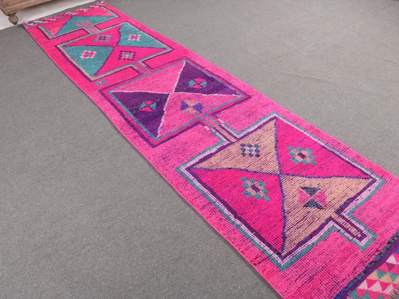 Türk Vintage Halısı, 2.7x11.2 ft Runner Halısı, Pembe Herki Çiçekli Halı