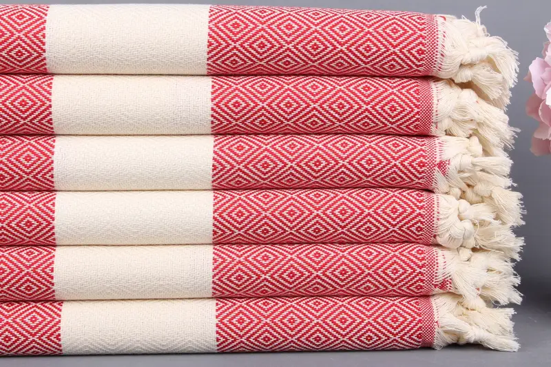 Kişiye Özel Organik Pamuk Plaj Havlusu, Kırmızı ve Bej, 40x71 İnç