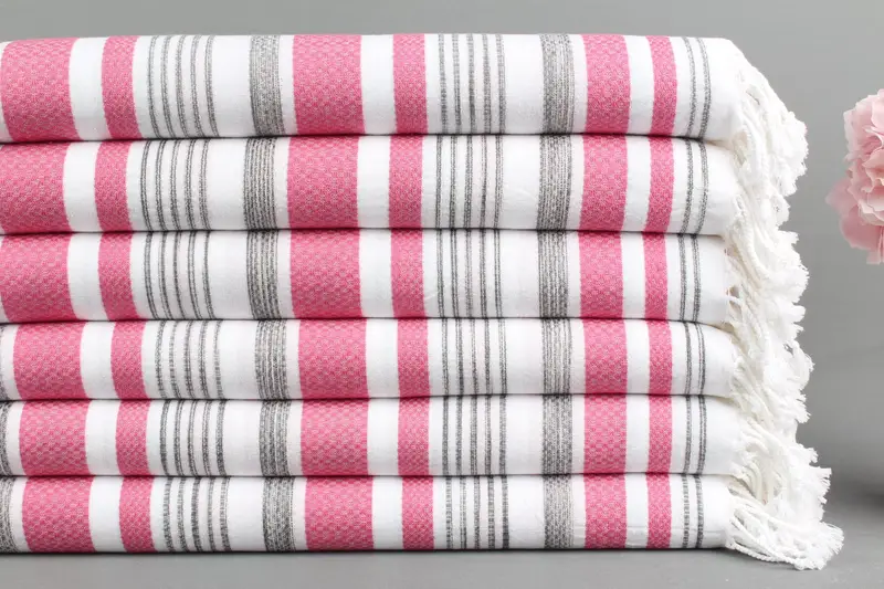 Banyo Havlusu Pembe-Gri Çizgili Türk Organik Pamuk, 38x71 İnç