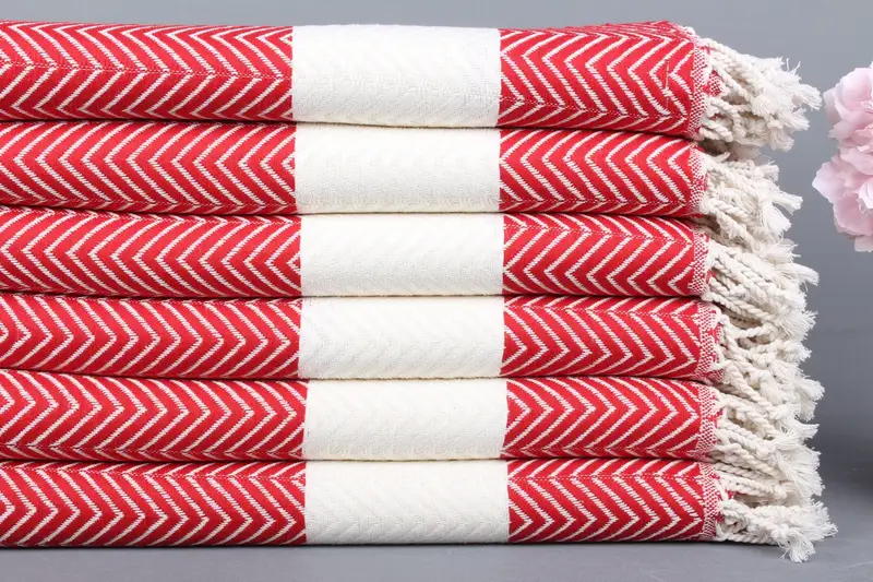 Kişiye Özel Türk Havlusu Kırmızı Bej Chevron Banyo Havlusu, 40x71 İnç