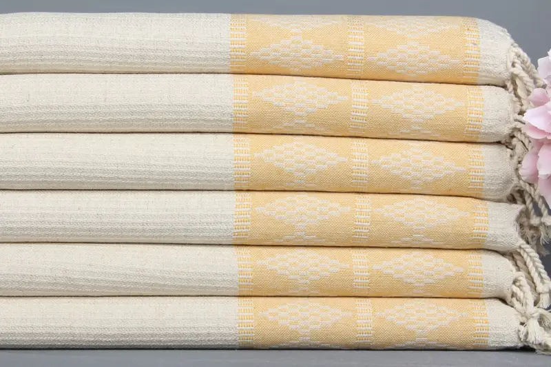 Özel İşlemeli El Havlusu Hardal Kilim Tasarım, Organik Pamuk, Bej, 20x40 İnç