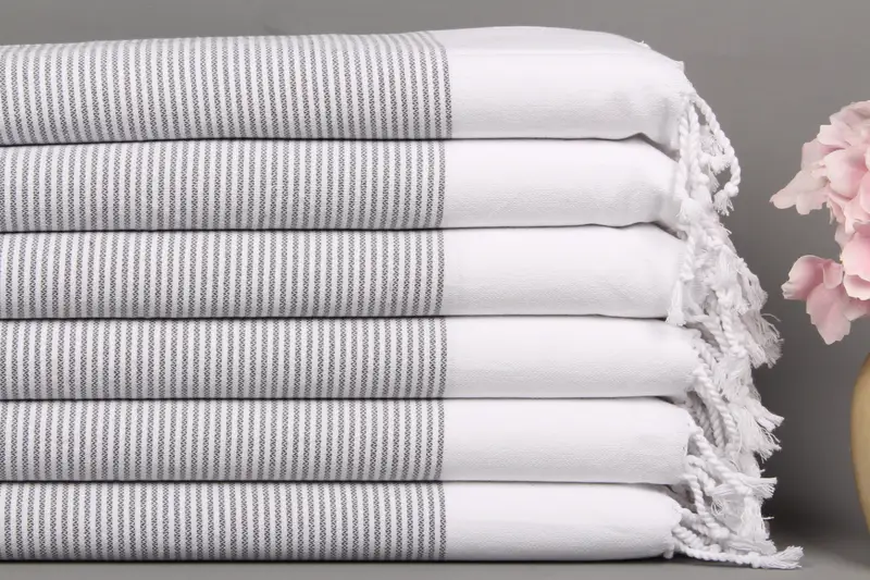 Çay Havlusu Nakışlı Gri Çizgili Organik Pamuk, 18x40 İnç