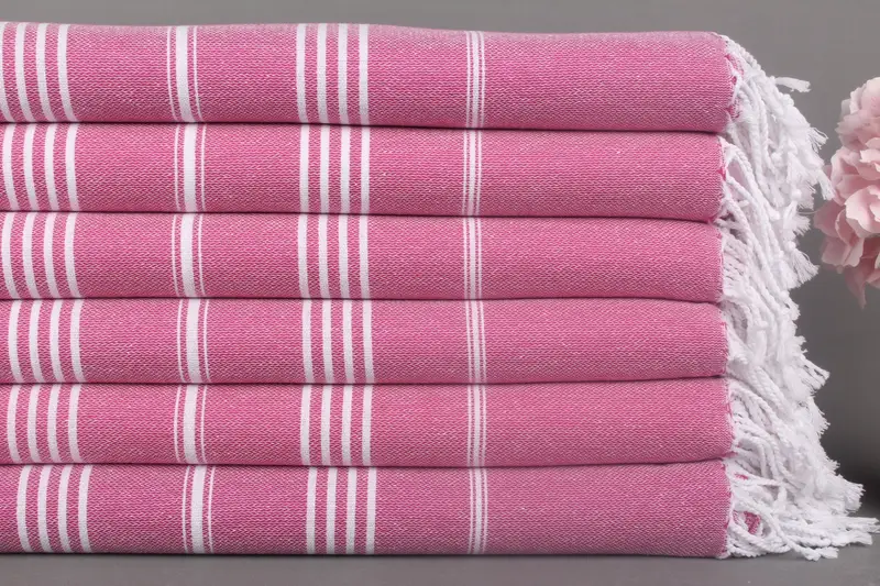 İşlemeli Plaj Havlusu Fuşya Çizgili Türk Pamuğu, 40x71 İnç