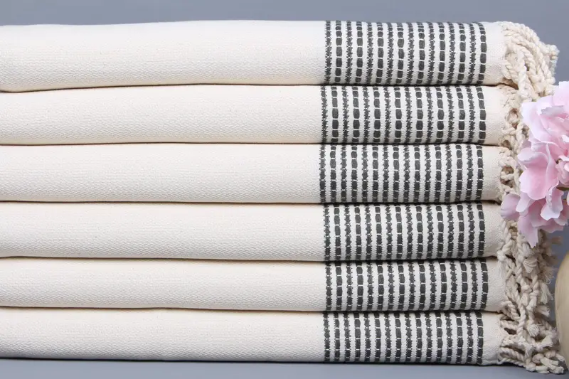 Türk Plaj Havlusu İşlemeli Organik Pamuk Haki Yeşil Çizgili, 36x69 İnç