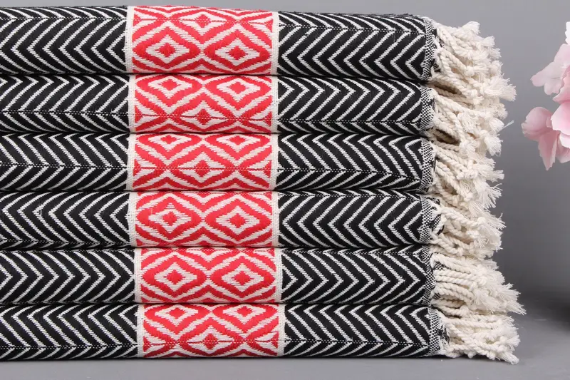 Organik Pamuk Plaj Havlusu Siyah-Kırmızı Şerit Peştemal, 40x71 İnç