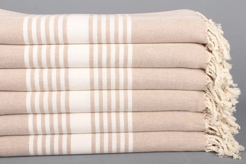 Türk Plaj Havlusu İşlemeli Pamuk Kahverengi Çizgili, 40x67 İnç