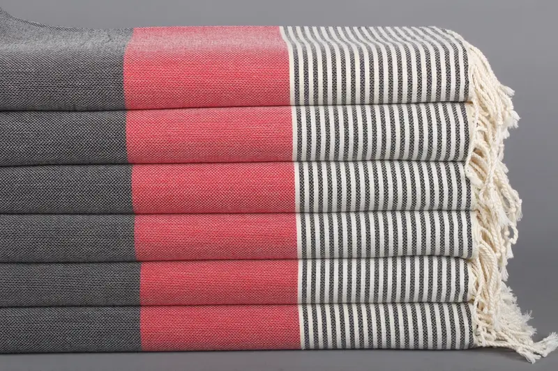 Plaj Havlusu Monogramlı Türk Pamuk Kırmızı-Siyah Çizgili, 40x67 İnç