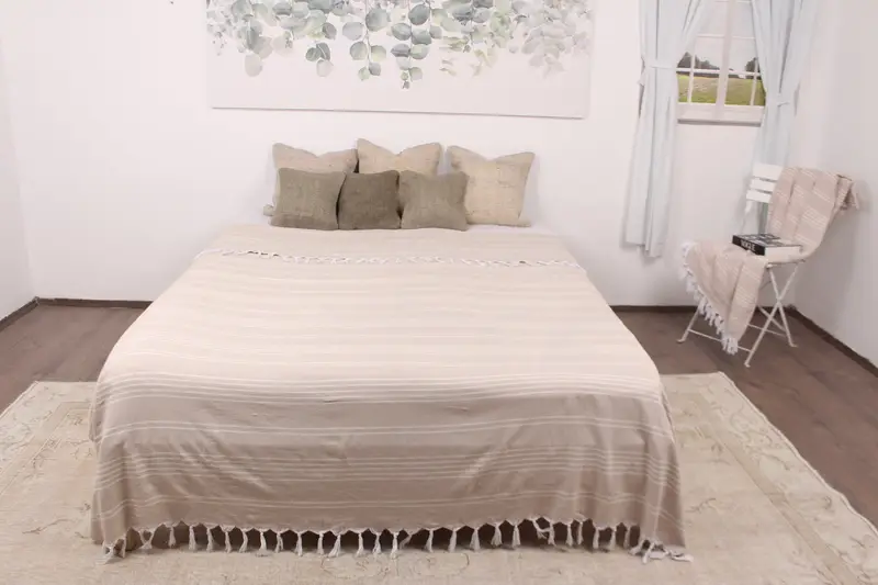 Piknik Battaniyesi Türk Organik Pamuk Bej Çizgili, 71x95 İnç