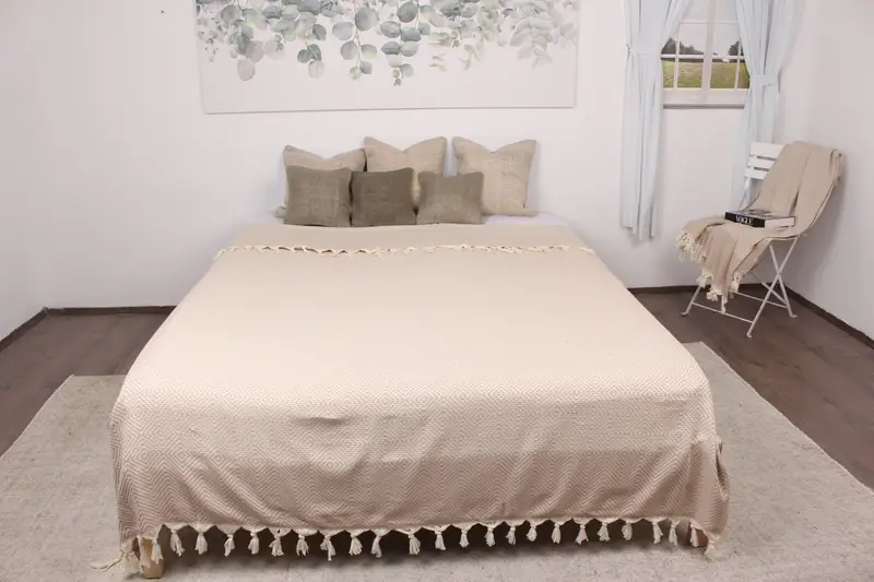 El Dokuma Bej Elmas Örtü, Organik Pamuklu Battaniye, 79x91 İnç