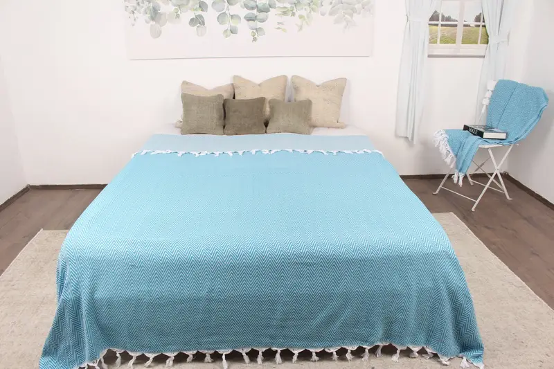 Kanepe Örtüsü Organik Pamuklu Turkuaz Chevron Battaniye, 79x95 İnç
