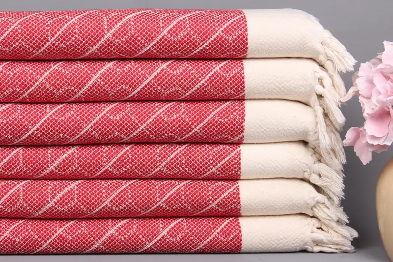 Monogram El Havlusu Organik Pamuk, Kırmızı Geometrik Desenli, 18x36 İnç