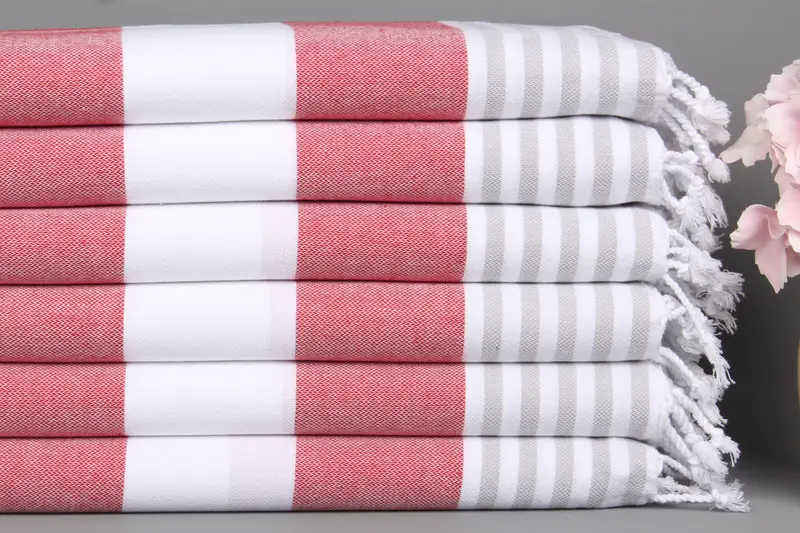 Pamuk Dokuma Bulaşık Havlusu Monogram El Havlusu Kırmızı-Gri Çizgili, 24x40 İnç