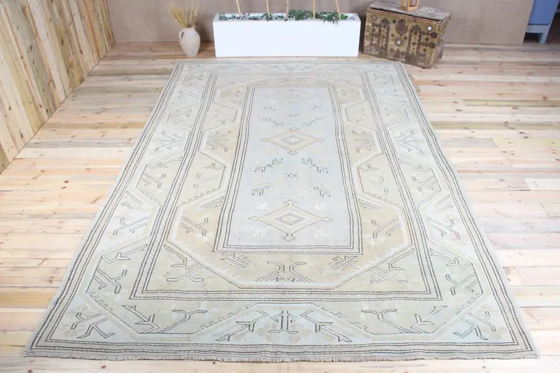 Vintage Halı, Büyük 8x11.7 ft Türk Halısı, Yeşil Geometrik Yün Halı