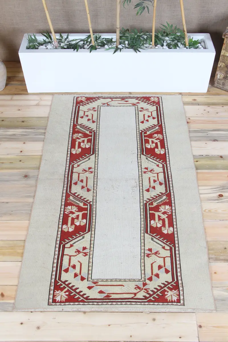 3.5x6 ft Türk Vurgulu Halı, Bej Kırmızı Vintage Geometrik Yün Halı