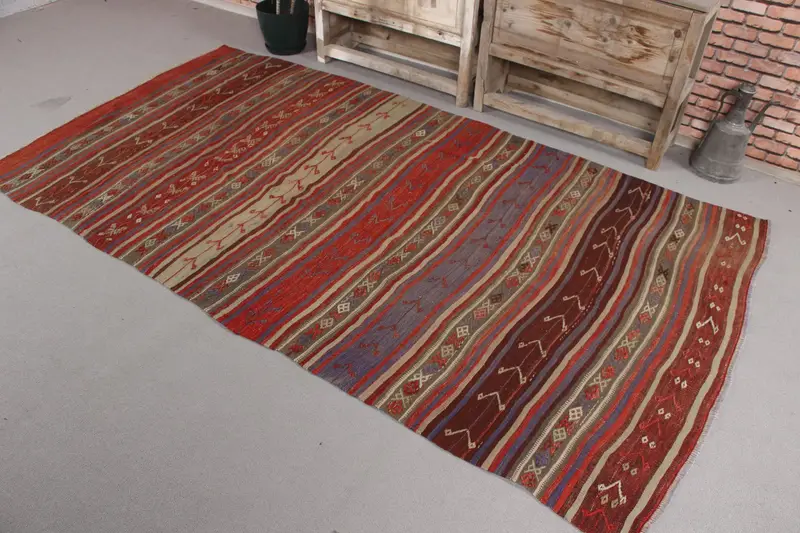 Vintage Halı, 4.6x8.4 ft Alan Türk Halısı, Kilim Kırmızı Mavi İran Halısı