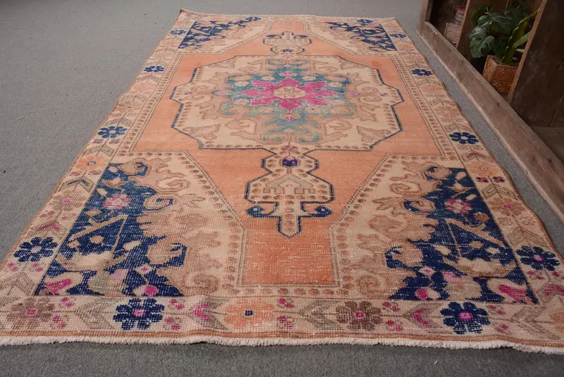 4.1x7.2 ft Vintage Türk Halısı, Alan Halısı, Turuncu Mavi Puantiyeli Yün Halı