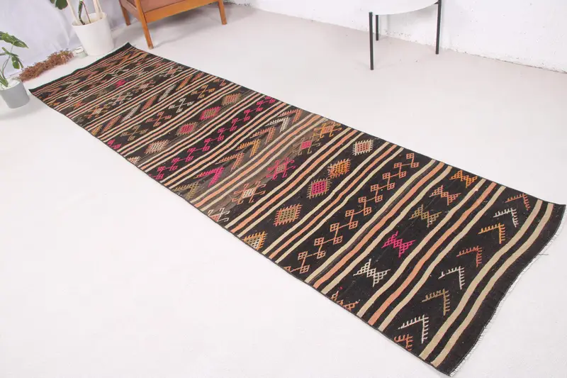 Vintage Türk Halısı, 2.9x10.9 ft Yolluk Halısı, Siyah Kilim Oryantal Halı