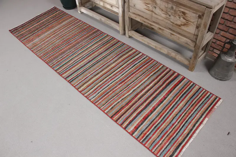 2.3x7.6 ft Türk Halısı, Vintage Runner Halısı, Kırmızı Mavi Ombré Halısı
