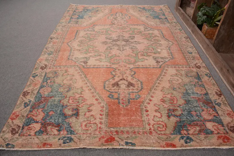 Vintage Türk Halısı 4.4x7 ft, Turuncu Oryantal Yün Halı