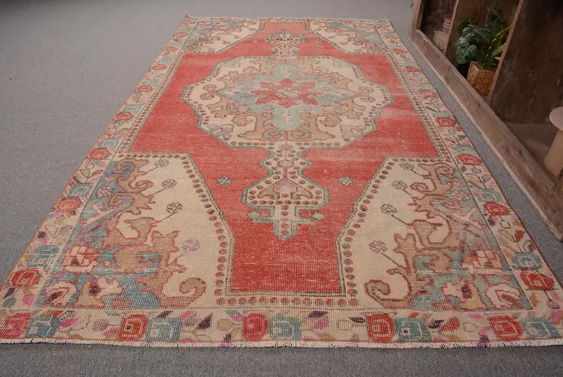 Vintage Halı, Alan 4.5x8.2 ft Türk Halısı, Kırmızı Mavi Çiçekli Yün Halı