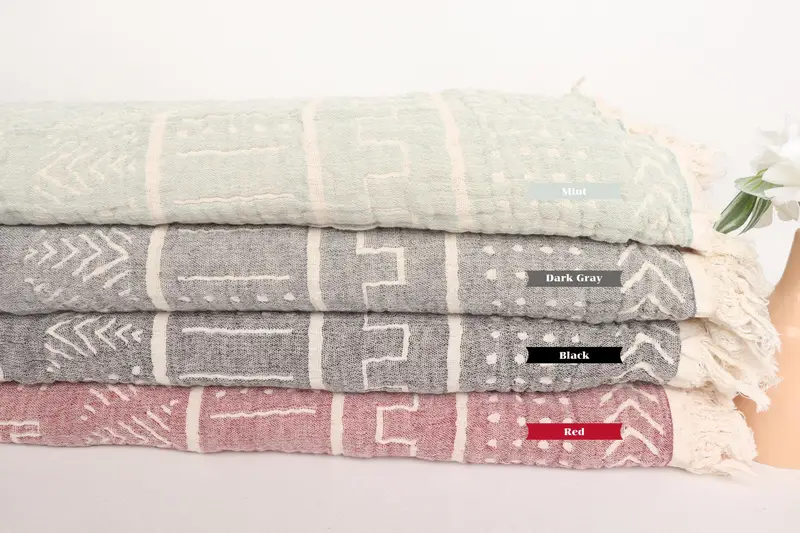 Dokuma Etnik Tasarım Pamuklu Battaniye 79x91 İnç, Bej Kareli, Sahil