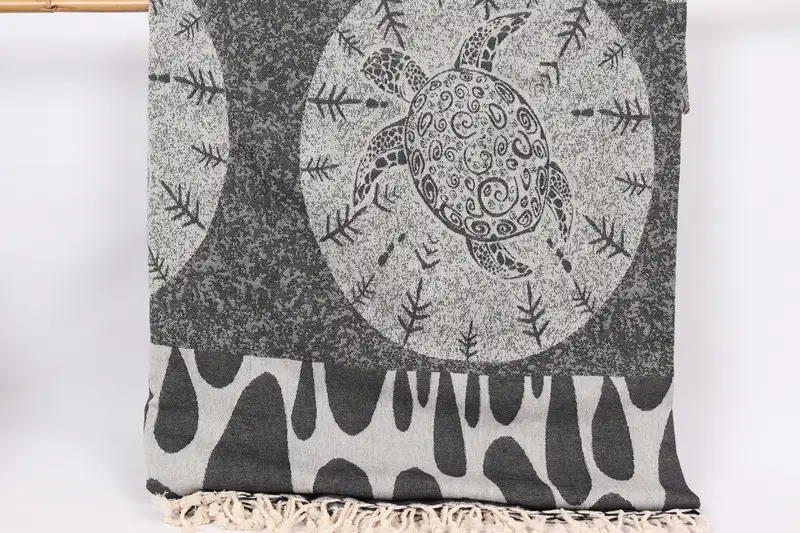 Kaplumbağa Tasarımlı Battaniye, 79x99 İnç, Siyah & Bej Pamuklu, Kıyı Stili