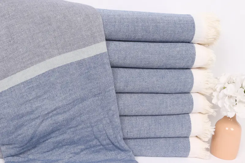 Lacivert-Nane Pamuk Çizgili Battaniye, Şal, 79x93 İnç