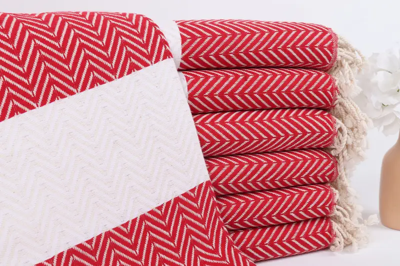 Özel Havlu Monogram Plaj Havlusu Kırmızı-Doğal Chevron 40x71 İnç