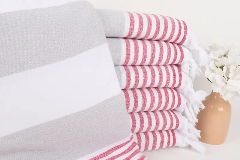 Pamuklu Havlu Çizgili Açık Gri-Kırmızı, 36x67 İnç