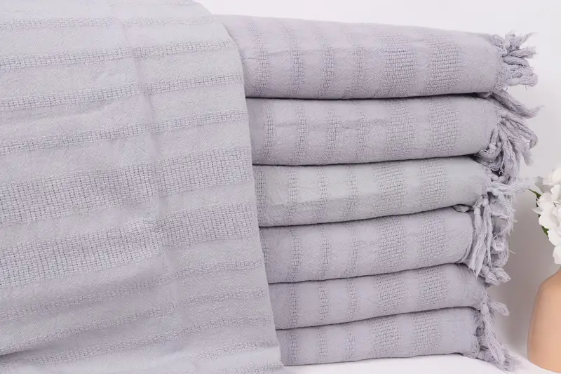 Kişiye Özel Gri Taşlanmış Çizgili Pamuklu Battaniye, 67x95 İnç