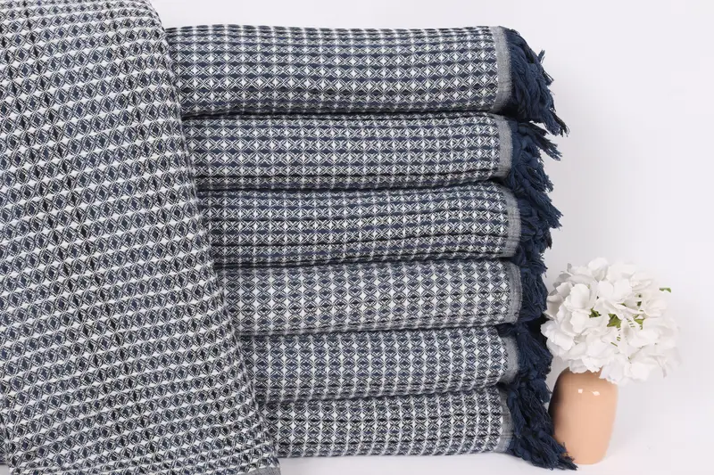 Lacivert Pamuklu Battaniye Çizgili Koltuklu 71x95 İnç, Nakışlı Organik Pamuk