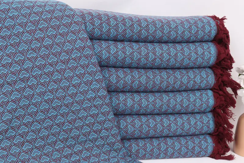 Turkuaz-Bordo Pamuklu Battaniye, Kalp Desenli, 75x87 İnç