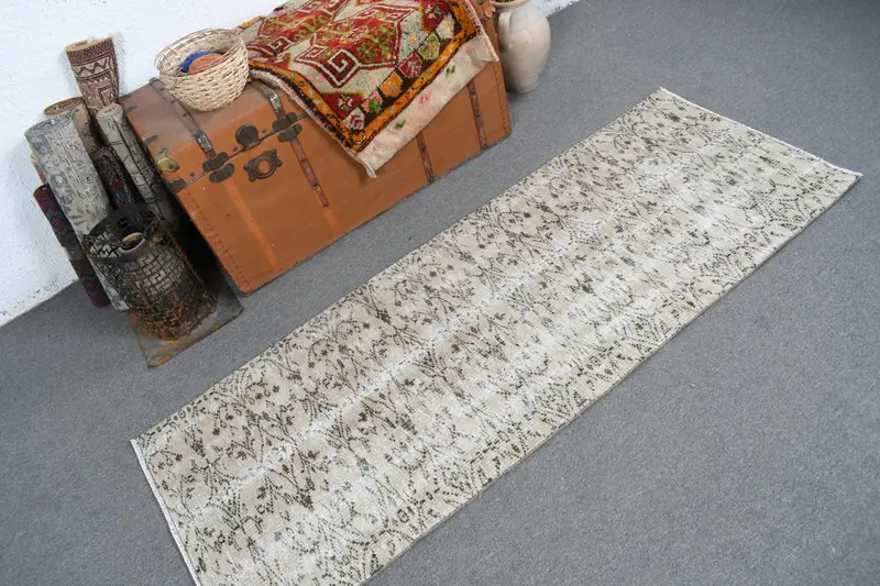 Türk 2.3x6.1 ft Runner Halı, Vintage Halı, Beyaz Patchwork Halı